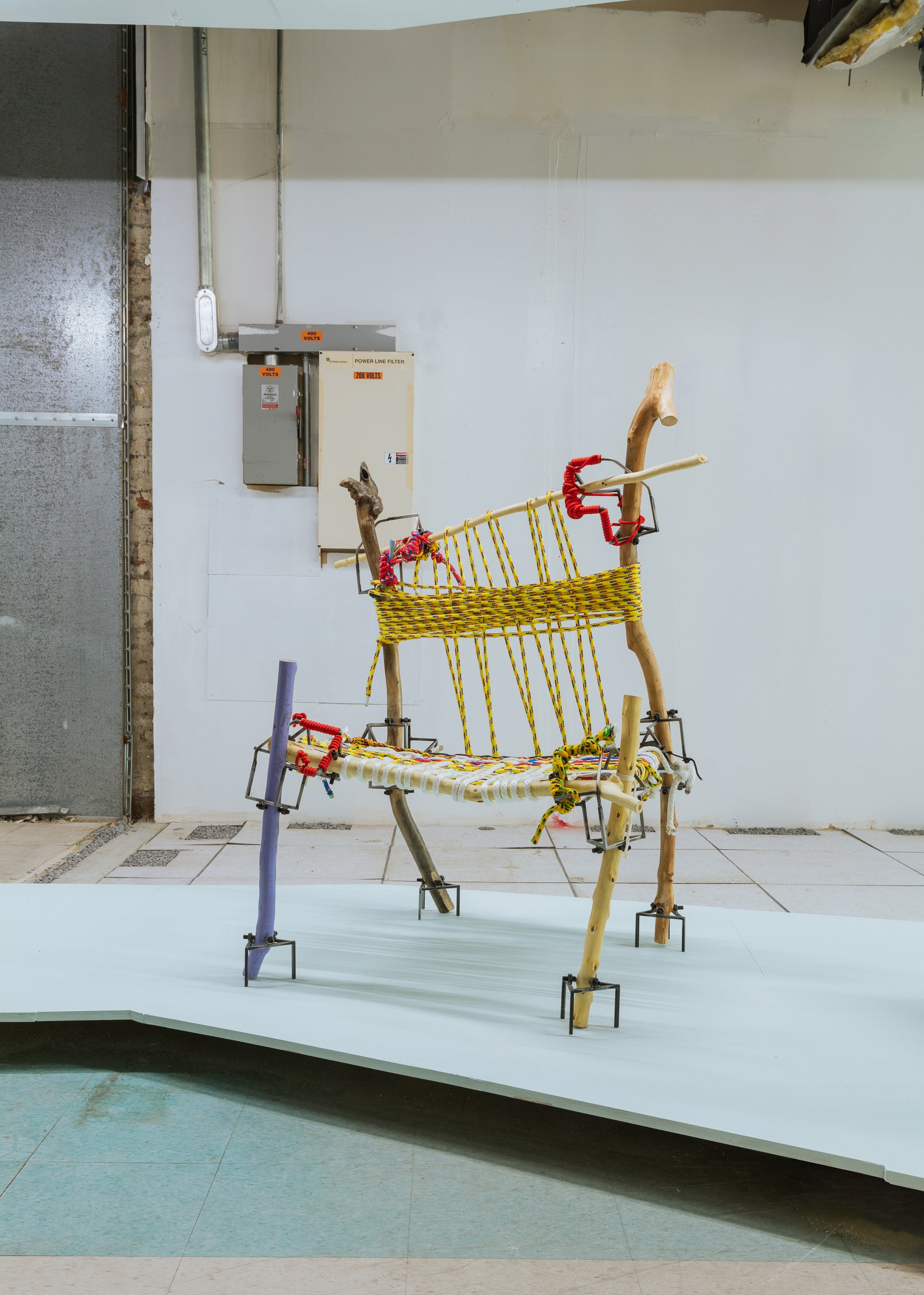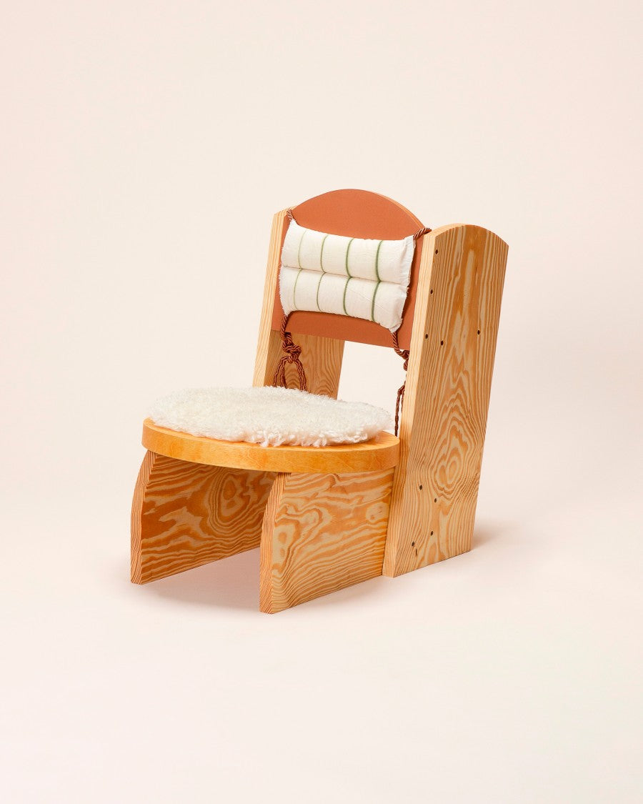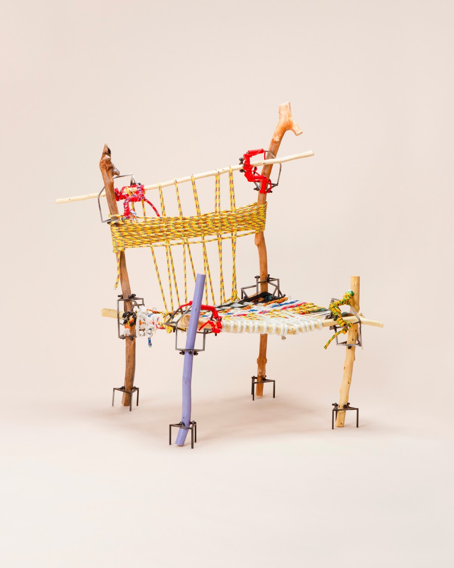 Shaina Tabak has fabricated her chair from the surplus wood and metal components of a variety of previously-realized projects, developing a seated work that stands with the subtle gravity and metallic brilliance of a medieval sentry. Similarly, the invitation to Chen Chen & Kai Williams to produce a make-do perch coincided with a studio move, providing ample opportunity for the duo to unearth material from past projects (some dating as far back as 2014). Their chair, a jaunty construction of wood, steel, and woven plastic bags, culminates in an asymmetrical, brightly-pigmented structure seemingly on the verge of animation. Sarah Burns continues to explore near-extinct furniture typologies with distinct references to Americana, fabricating a slipper chair that foils soft materials, such as pillows and a sheepskin, within more emphatic structures of rope and thickly-hewn slabs of pine.